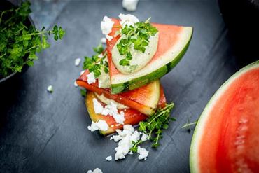 Wassermelonen-Triple: Melone mit Schafskäse und Orangen-Nusspesto