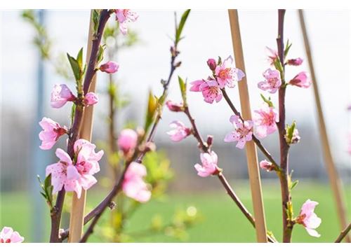 Blaues Osterei mit gelber Blüte im Pfirsichbaum ‚Fruit Me® Icepeach‘