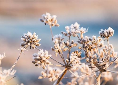 Was Stauden jedoch zur Verzweiflung treiben kann, ist die sogenannte Frosttrocknis. Von dieser durch Frost ausgelösten Trockenheit spricht man, wenn Wintersonne und Frost aufeinanderprallen: Durch langanhalten Frost ist das Wasser im Boden gefroren. Zugleich scheint die Wintersonne auf die Blätter der Gräser, die ihr Wasser an die Luft abgeben. Normalerweise würden sie nun neues Wasser über die Wurzeln aus der Erde aufnehmen. Wenn jedoch das Wasser im Boden gefroren ist, ist dies nicht mehr möglich und die Pflanze verdurstet.