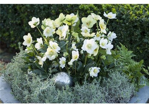 Die Christrose (Helleborus niger) ‚WinterSun®‘ ist eigentlich eine typische Gartenstaude, die sich am liebsten draußen im Garten oder auf dem Balkon aufhält. Wer jedoch eine weihnachtliche Bepflanzung für den Wintergarten sucht oder es einfach zeitlich nicht mehr geschafft hat, die Christrose in den Garten zu pflanzen, kann die hübsche Staude auch für sechs bis acht Wochen als Zimmerpflanze kultivieren. Dafür braucht es nur einen schönen, großen Kübel und einen hellen, kühlen Fensterplatz. Da die Christrose Temperaturen um die 10 – 15 Grad schätzt, fühlt sie sich in einem kühlen Wintergarten, in einem hellen Treppenaufgang oder auf der Fensterbank in einem weniger stark beheizten Zimmer besonders wohl.